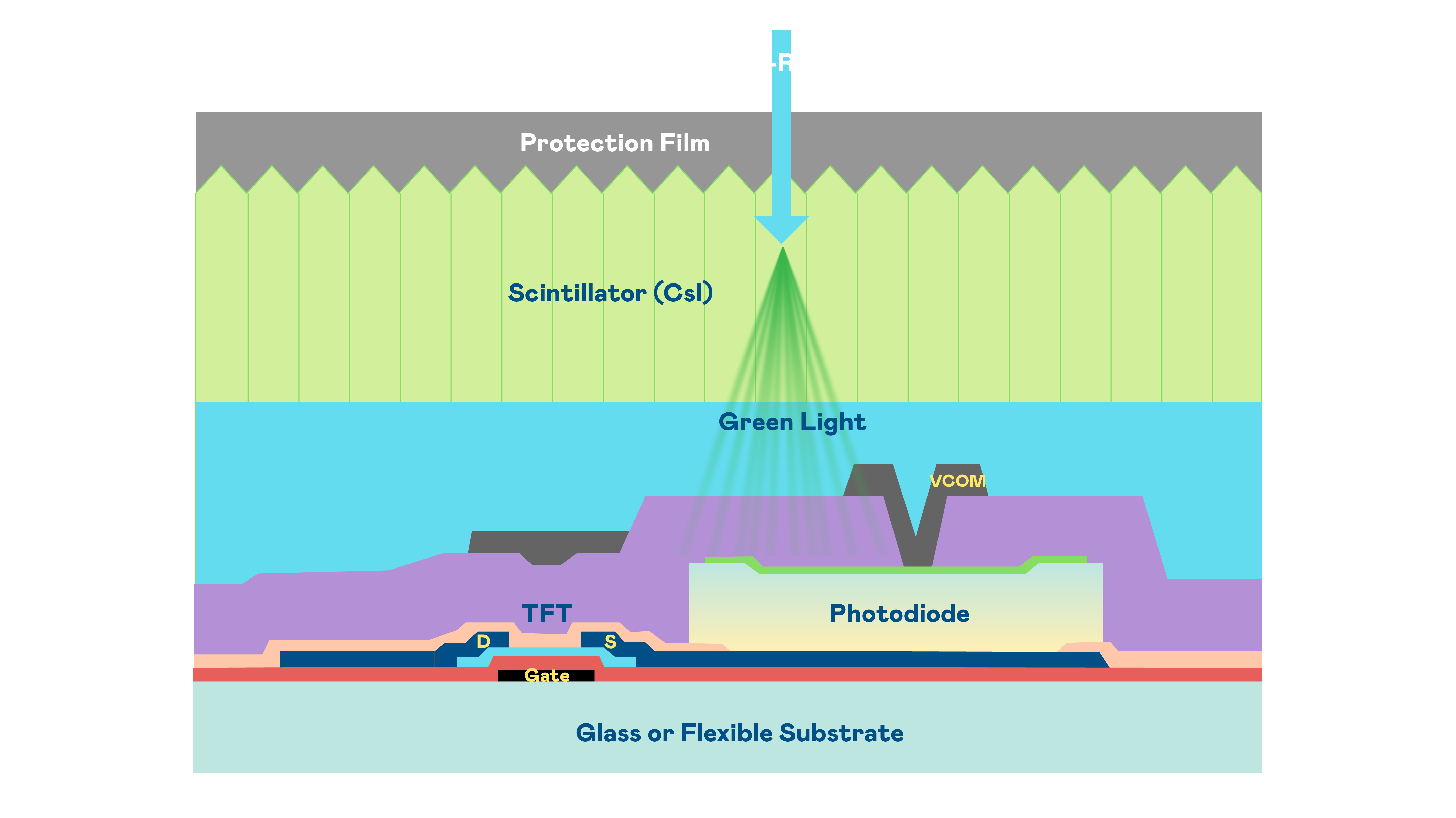 开云体育的X光影像感測陣列使用薄膜電晶體 (TFT) 作為每個像素的讀取開關,搭配光電二極體(Photodiode)的光電轉換元件,用以感測X光影像訊號。